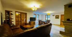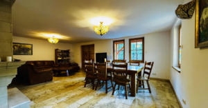 - salon / pokój dzienny z jadalnią - z kominkiem i wyjściem na kamienny taras przy basenie od strony południowej , meble jadalniane drewniane , sofa marki Kler - 43,05 m2