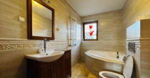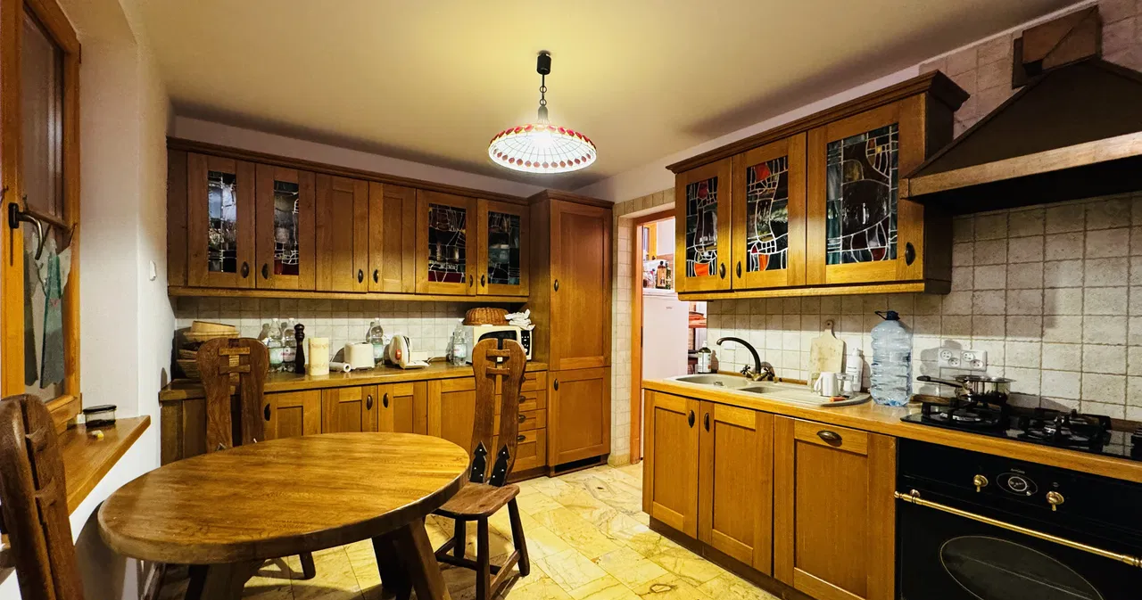 Dom wyposażony głównie w drewniane porządne meble , na parterze podłoga marmurowa , kamień świetnie przewodzi ciepło z podłogówki , w kuchni i sypialniach również meble z litego drewna , podłogi na poddaszu użytkowym drewniane , zaś w łazienkach marmur jak na parterze , wejście do domu z płyty kamiennej , taras z płyt kamiennych , basen odlew o długości 8 metrów a szerokości 4 metry - wykończony również płytami kamiennymi , wszystko jest tutaj bardzo stylem konsekwentnie i solidnie wykonane.